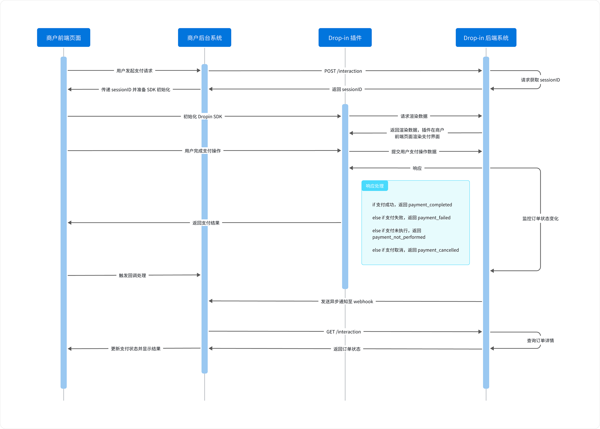 在初始化 DropInSDK 之前,必须先获取 sessionID。后端通过调用 integration API 响应中获取 sessionID,需提取并传递给前端的 DropInSDK。