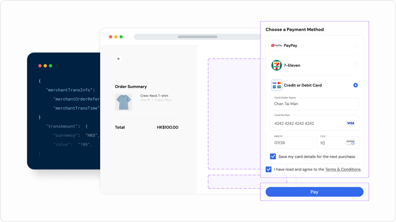Drop-in is a fully PCI DSS certified solution to process, store and transmit card information securely, helping merchants who do not obtain such a certificate quickly launch their business and the related requirements on card payment processing.