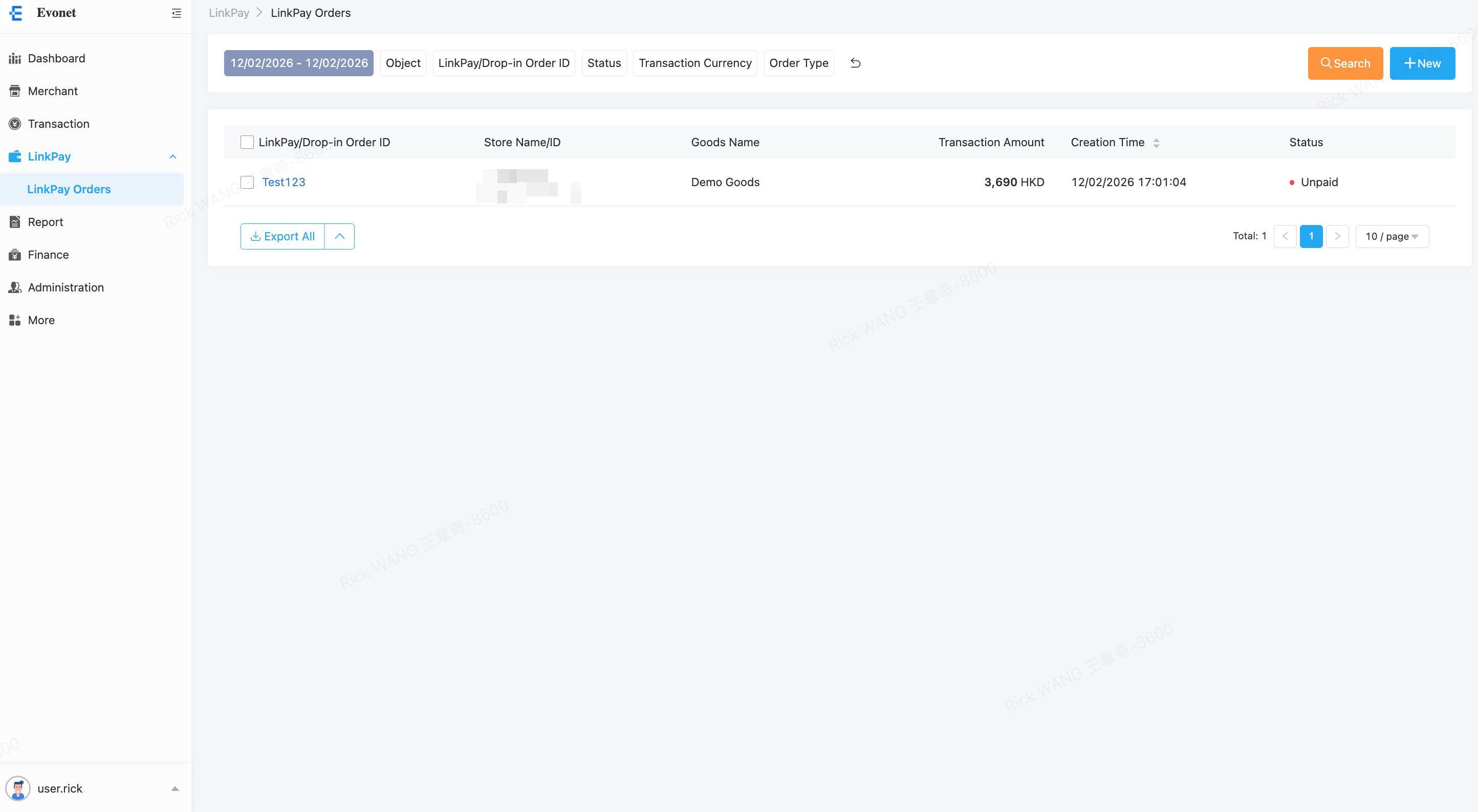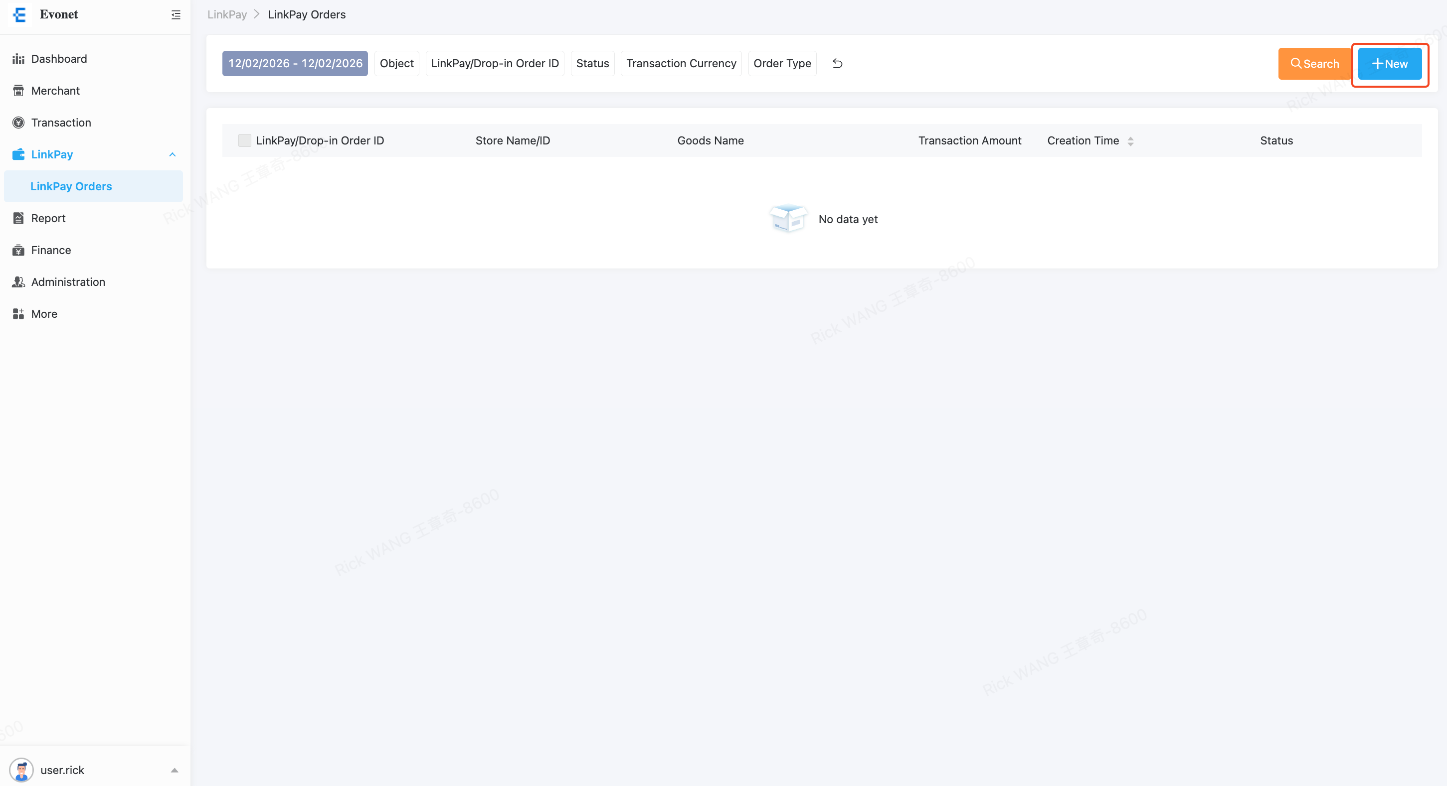 Click the "+New" button to create a new LinkPay order.