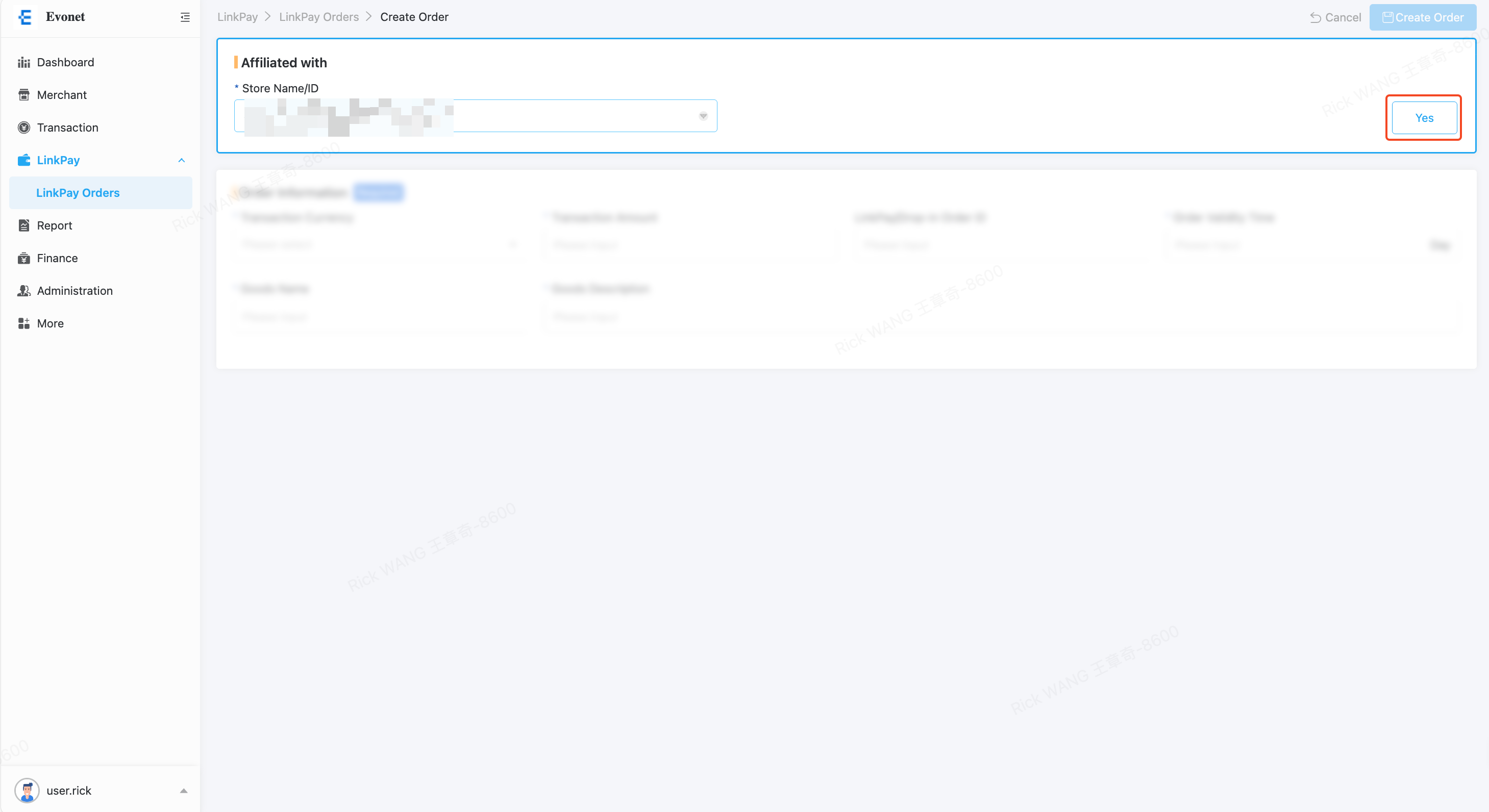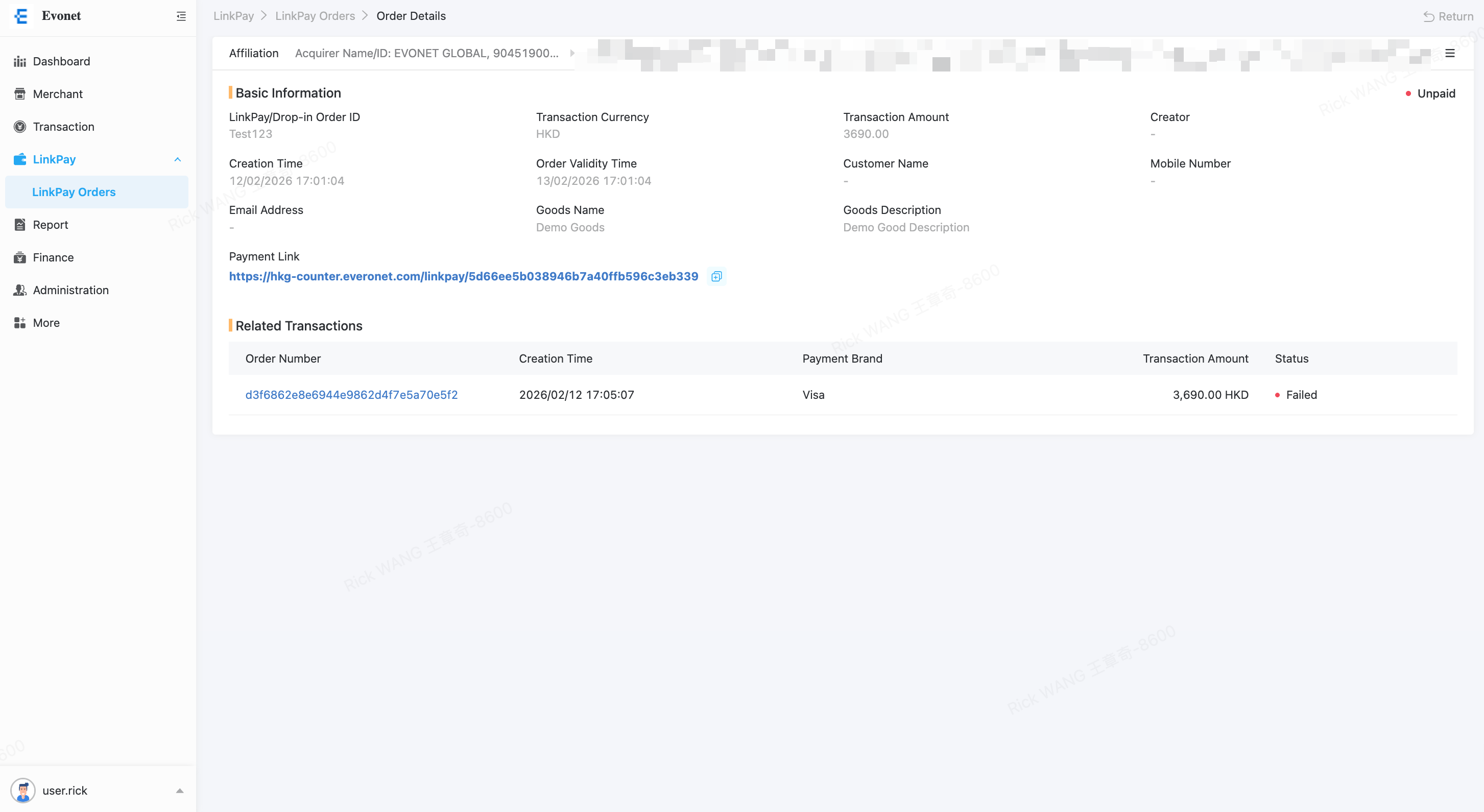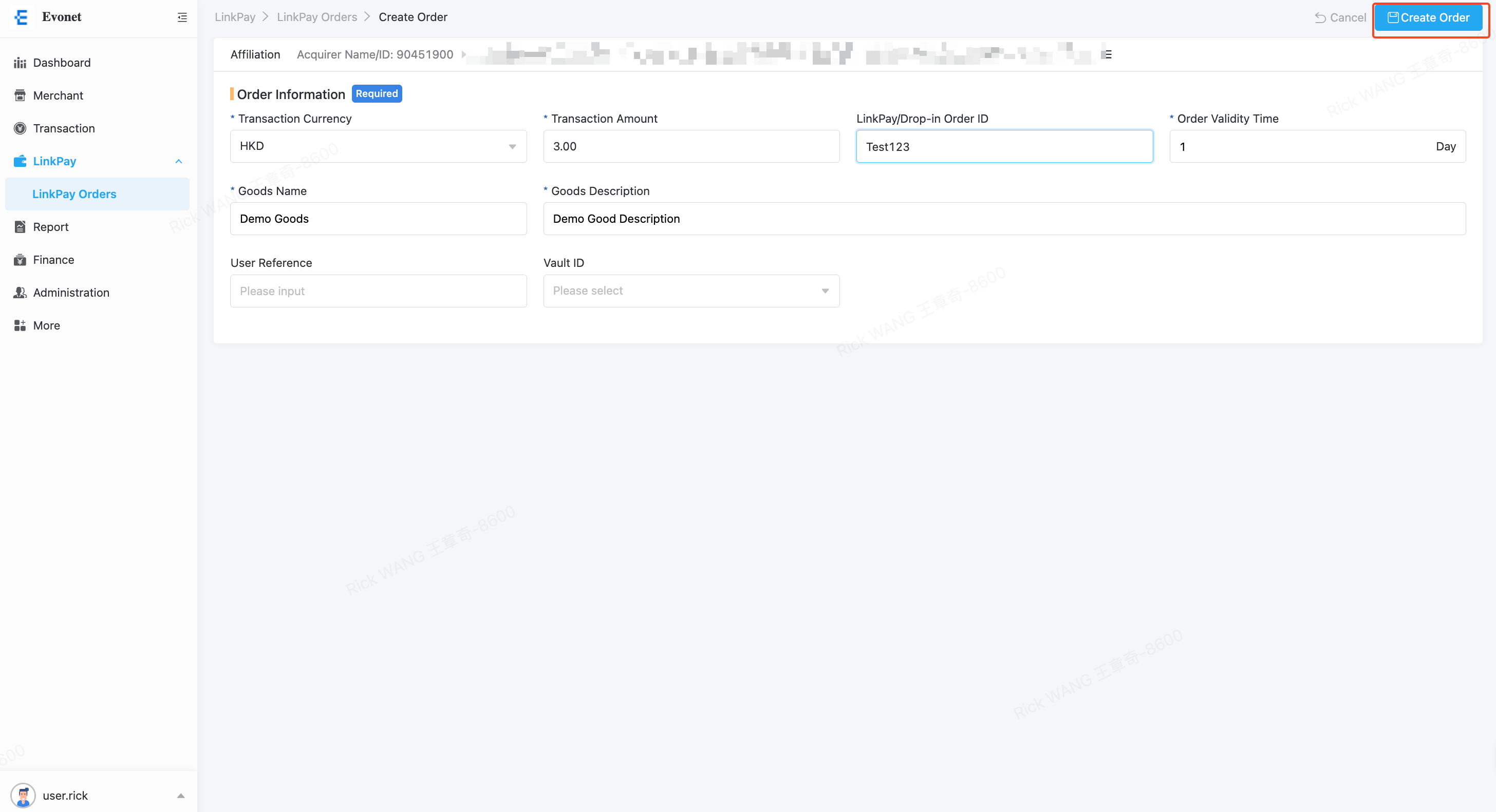 Enter the transaction amount, LinkPay Order ID, Order Validity Time, Goods Name and Goods Description.